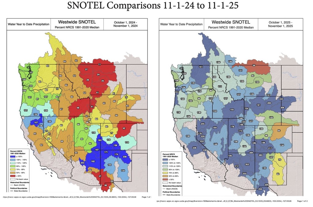 Comparing Western U.S. SNOTEL maps from Nov. 1, 2024 and Nov. 1, 2025. LaNina is playing a big part in significant early snowpack.